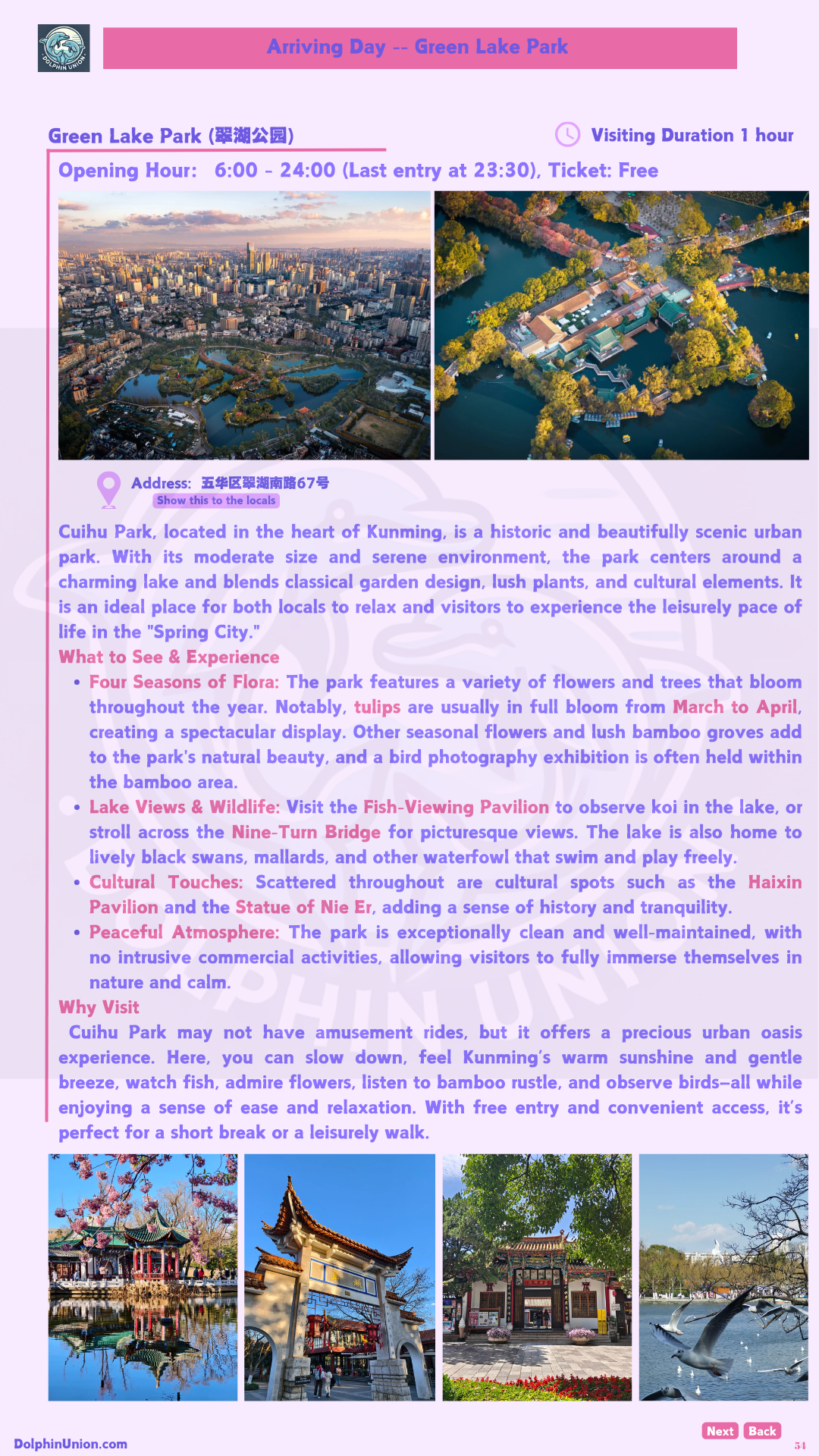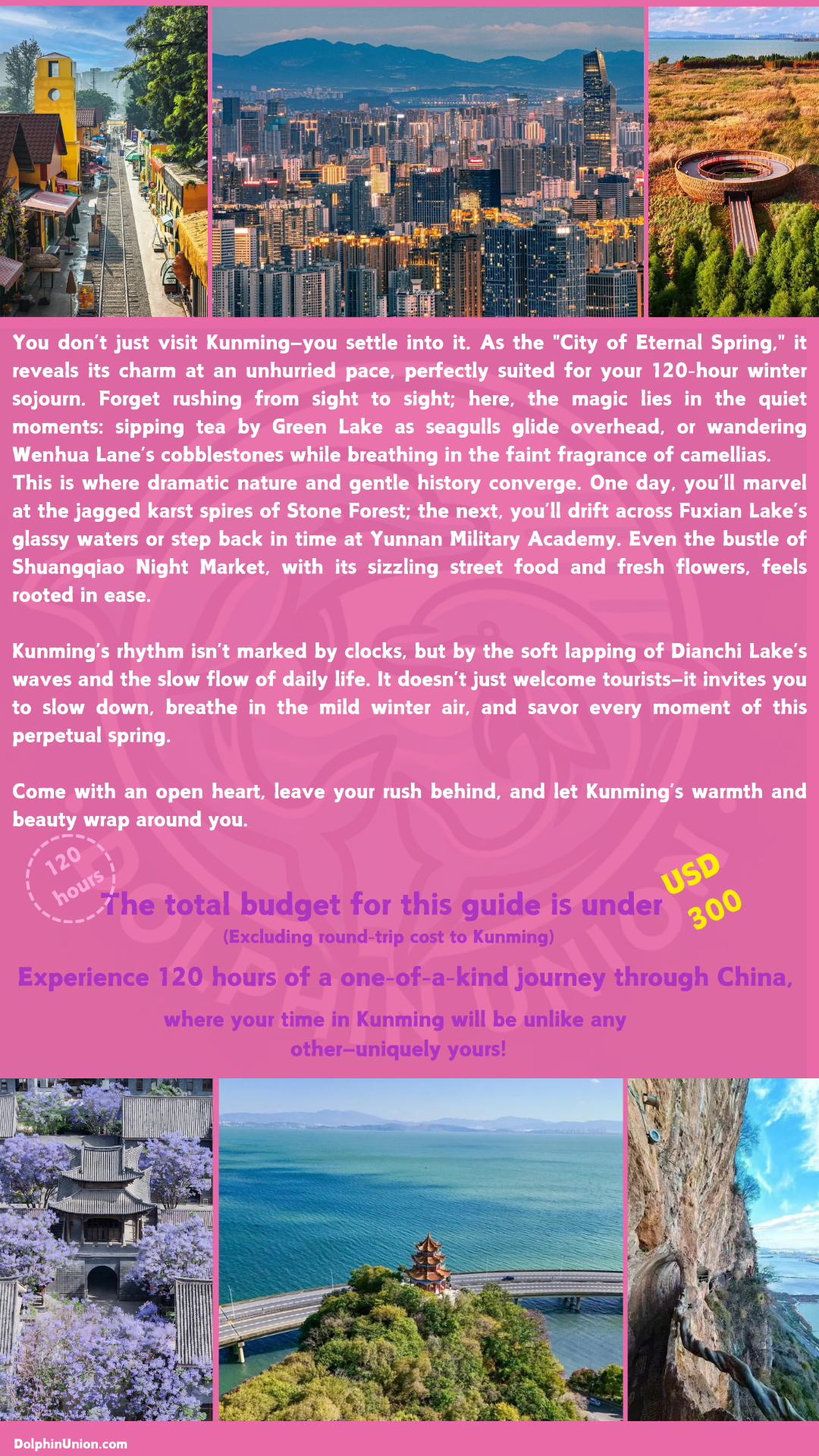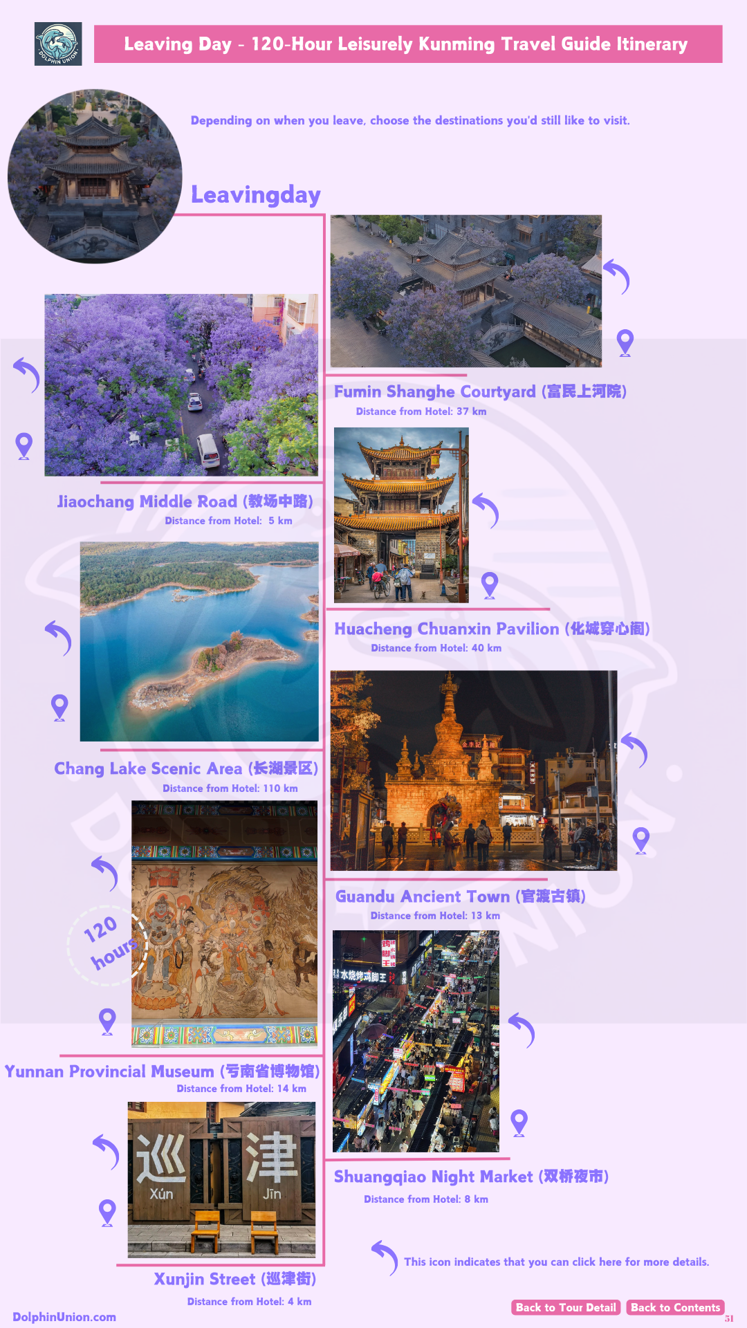 - Curated Excursions: Jiuxiang Scenic Area (underground karst caves and waterfalls) + Guandu Ancient Town (ancient pagodas and spring magnolias); leaving-day options (Fumin Shanghe Courtyard jacarandas, Huacheng Chuanxin Pavilion).