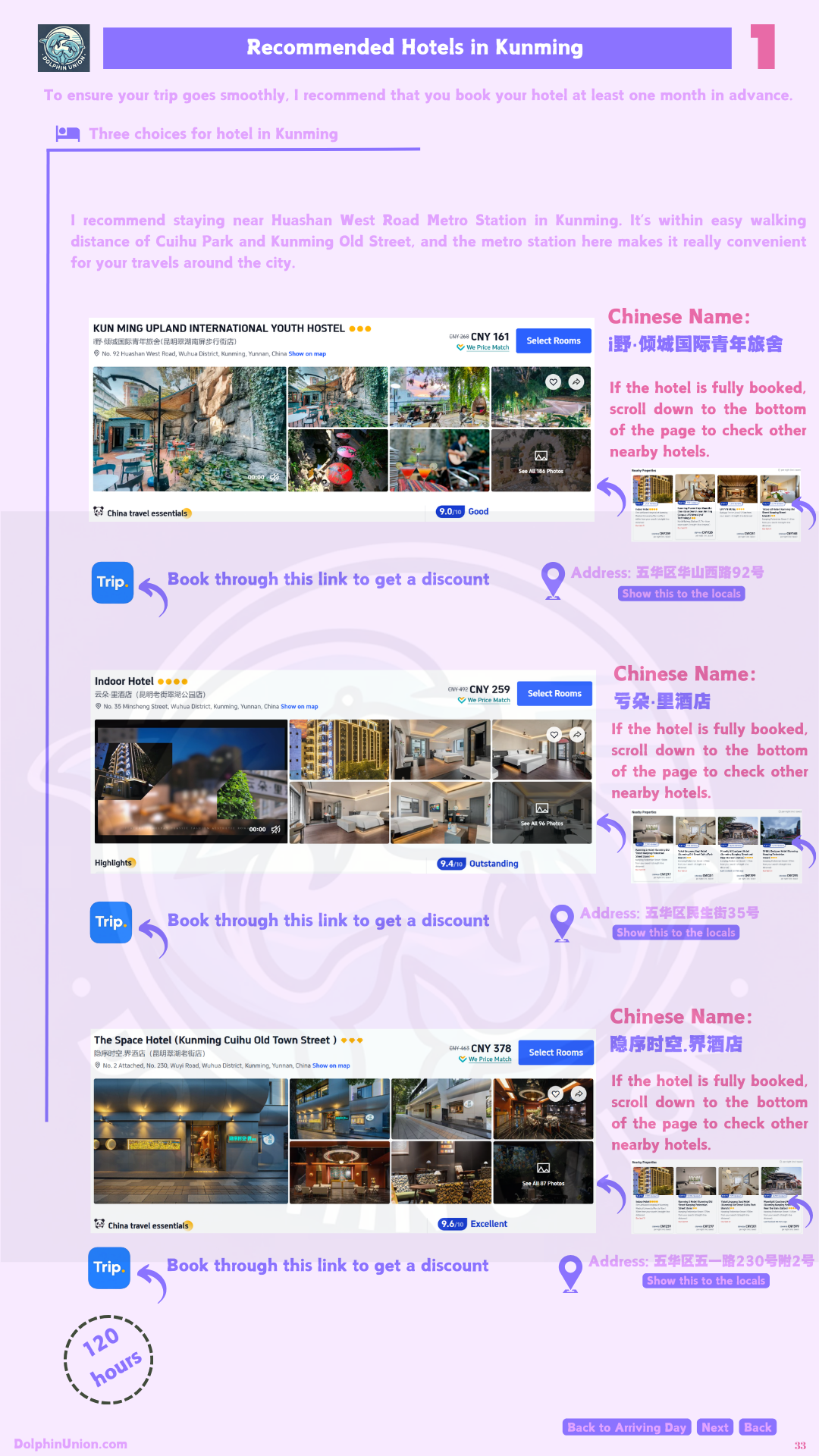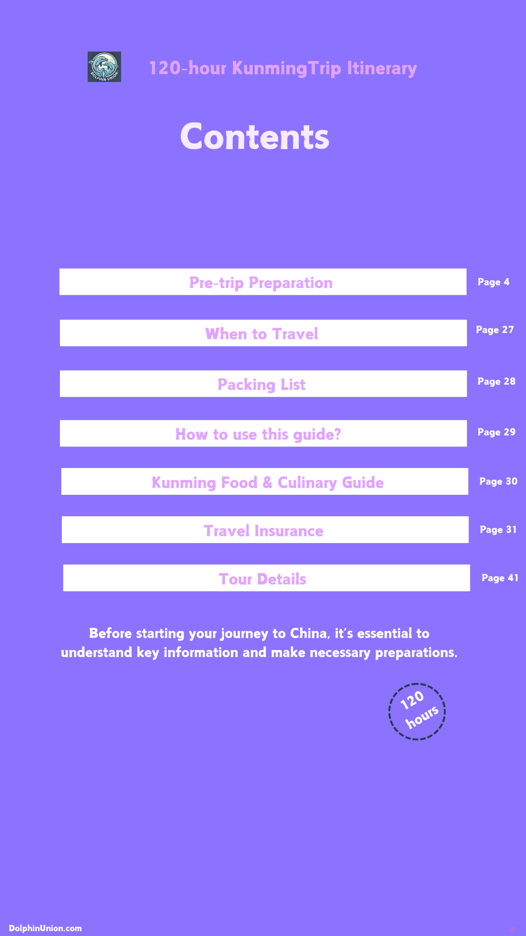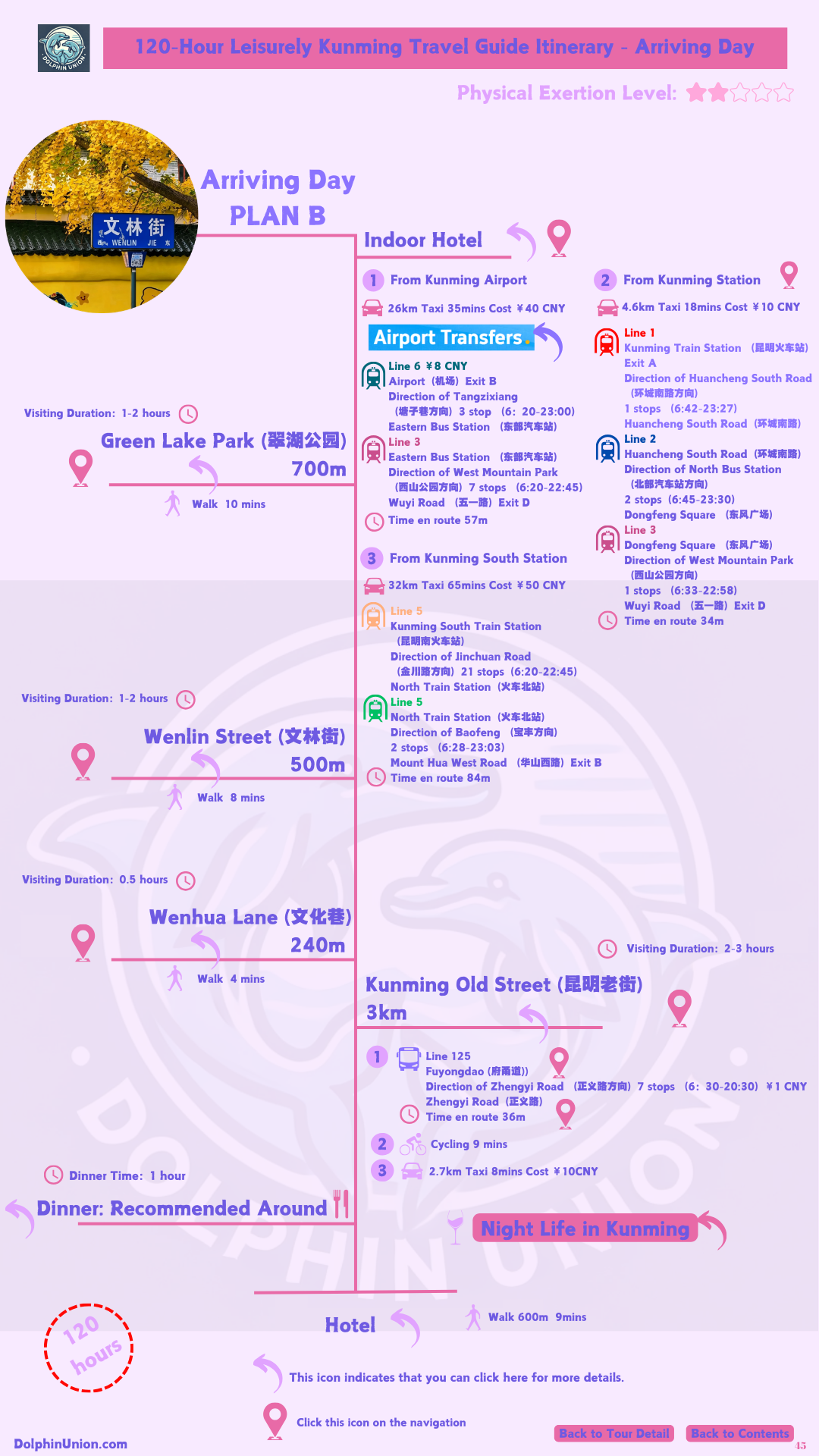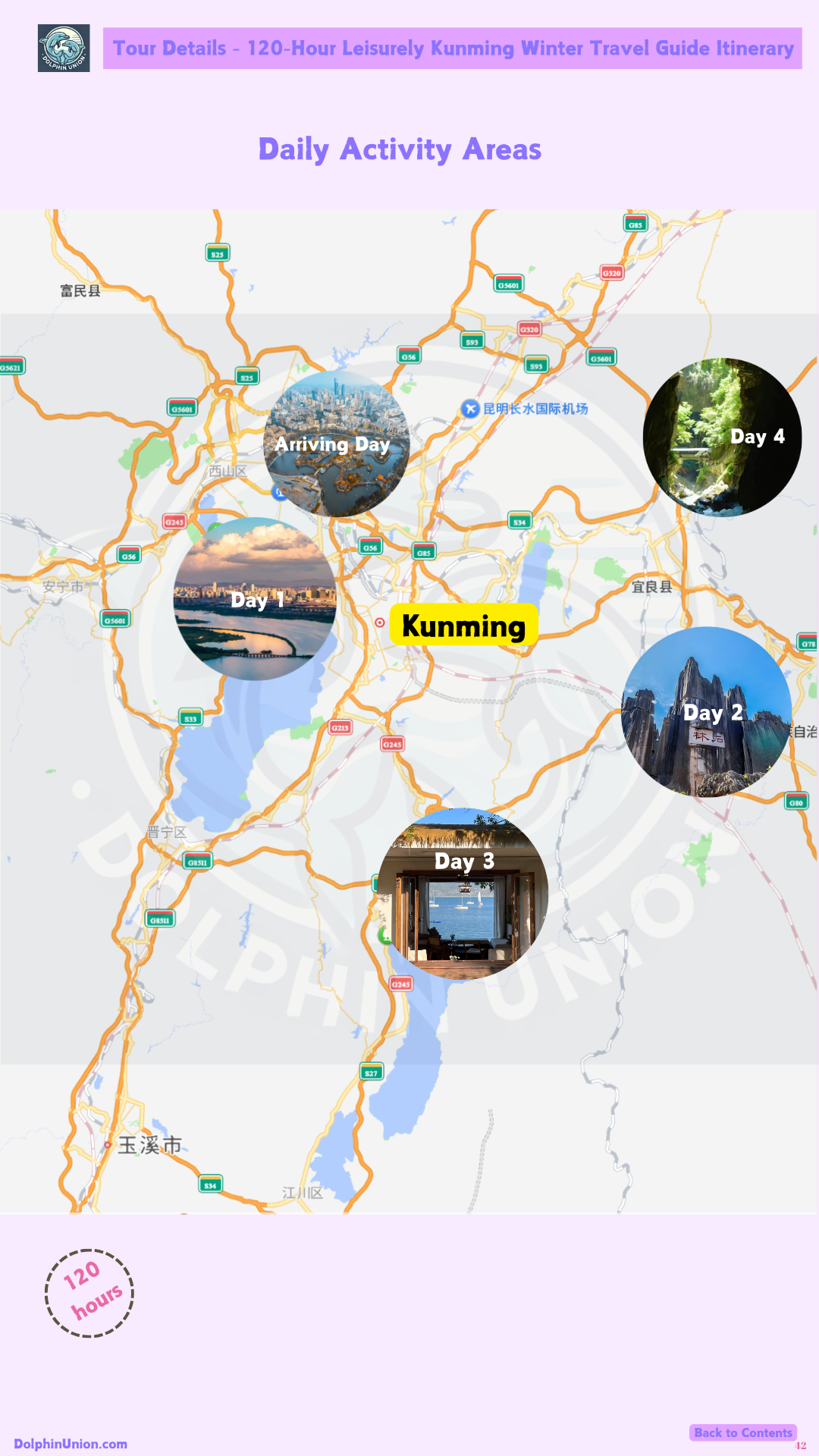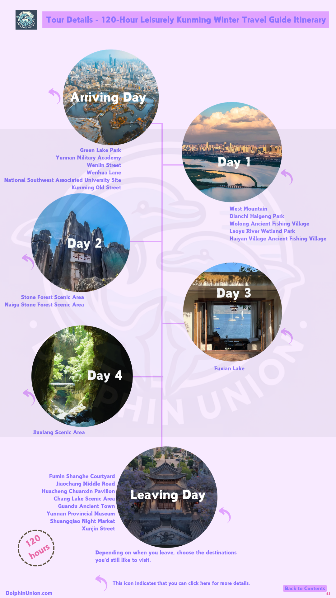 - 120-hour customized itinerary: Hour-by-hour plans for arrival day (3 flexible options based on arrival time), Day 1 (West Mountain + Dianchi Lake villages), Day 2 (Stone Forest + Naigu Stone Forest), Day 3 (Fuxian Lake), Day 4 (Jiuxiang), and Leaving Day (optional attractions).