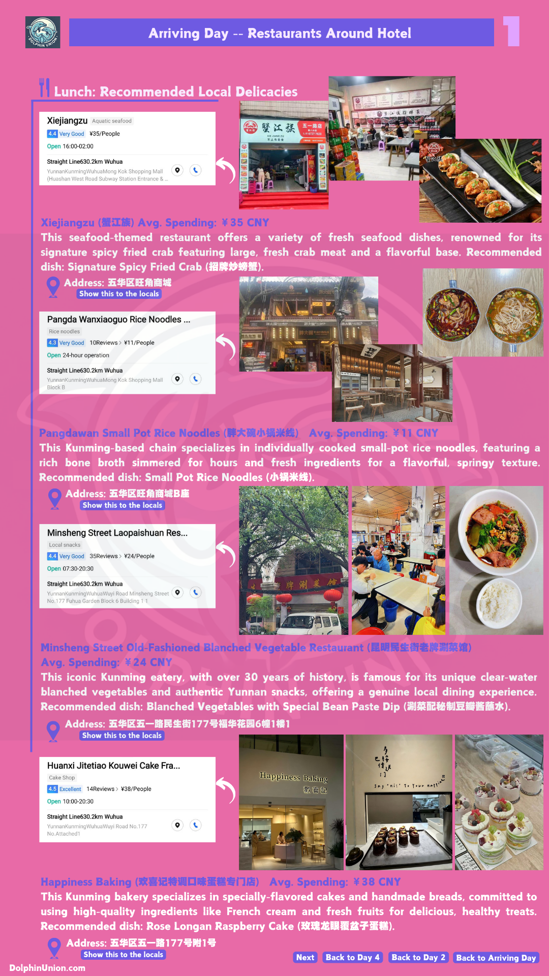 - Local Eats Guide: Daguan Zhuanxin Farmers’ Market food map (don’t miss pea jelly and fermented rice milk); halal restaurant recommendations (Malaoduo Hot Pot, Xinxilan Xinjiang Halal Restaurant) across key areas.